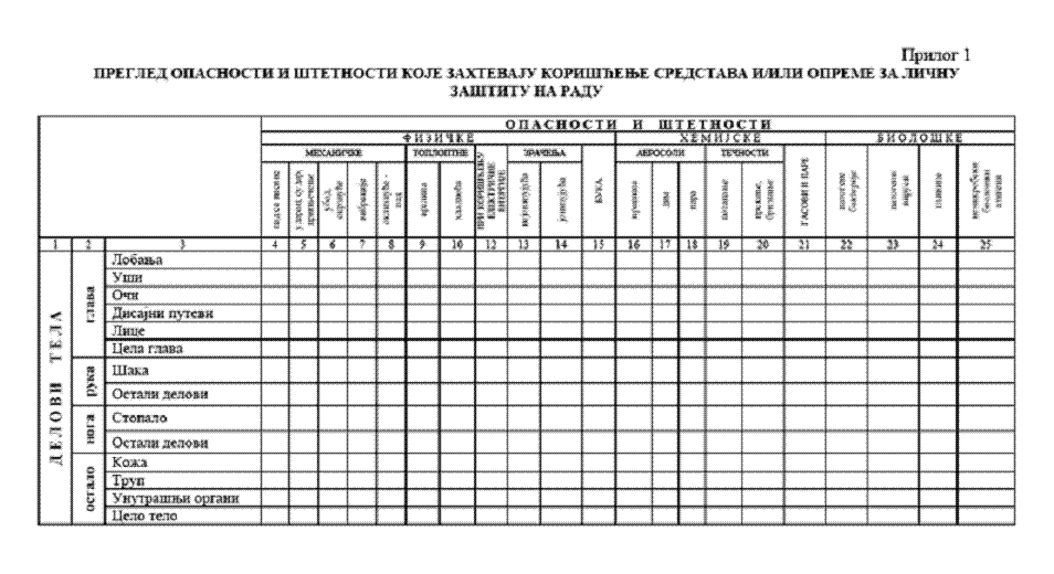 Poslodavac je dužan da sačini Pregled opasnosti i štetnosti koje zahtevaju korišćenje sredstava i/ili opreme za ličnu zaštitu na radu (Prilog 1), kao i da odredi sredstva i opremu za ličnu zaštitu na radu koja odgovaraju Pregledu sredstava i opreme za ličnu zaštitu na radu (Prilog 2).